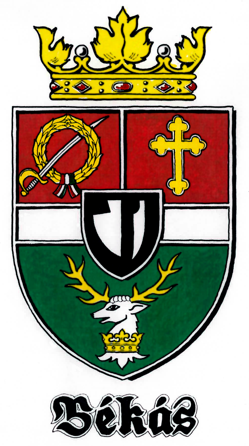 Alsó zöld mezejében lebegő, jobbra fordult, arany agancsos ezüst szarvasfej, nyakán arany lombkoronával.